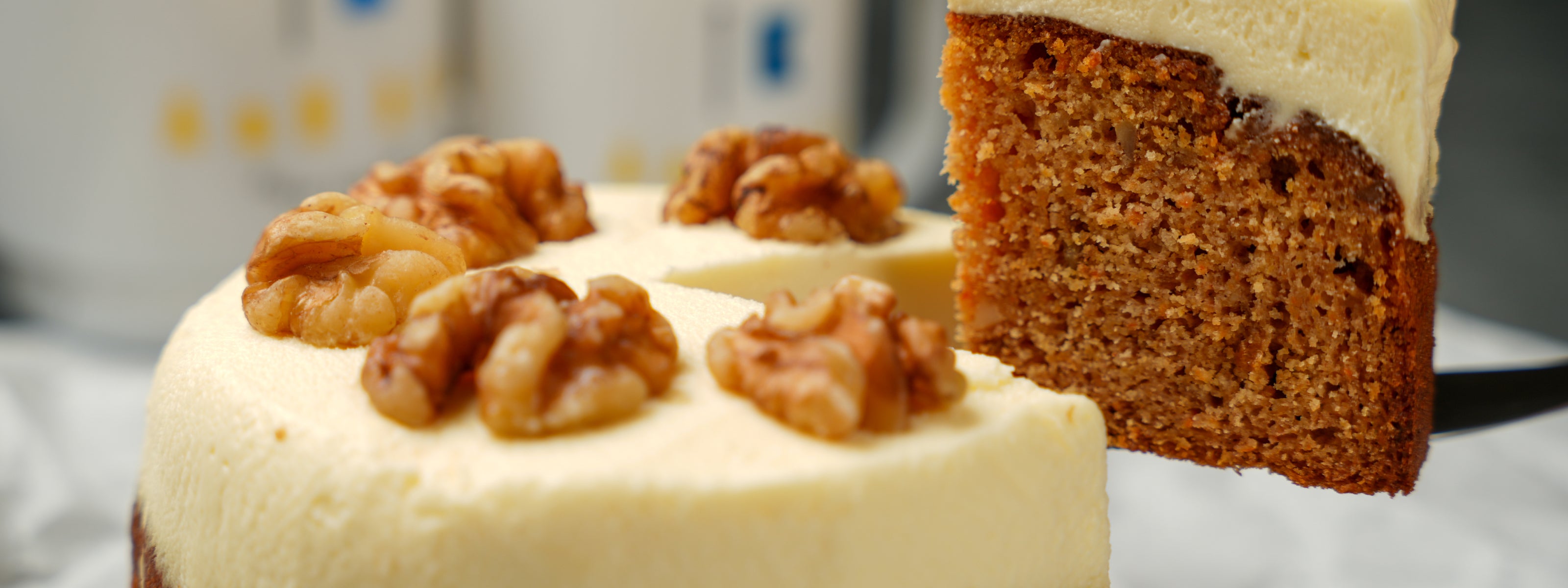 たっぷりの人参のすりおろし、くるみ、レーズン、スパイスが入ったグルテンフリーの生地にクリーミーなクリームチーズのアイシングが乗ったやみつきケーキです。